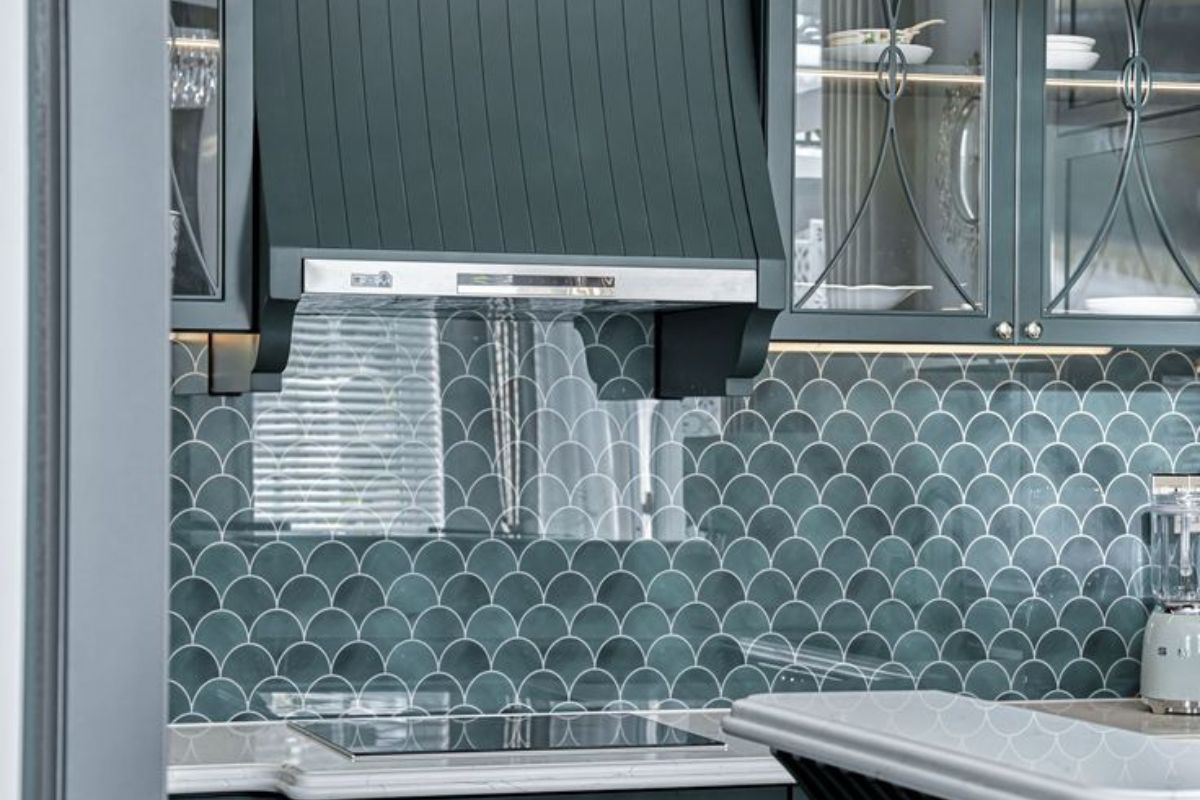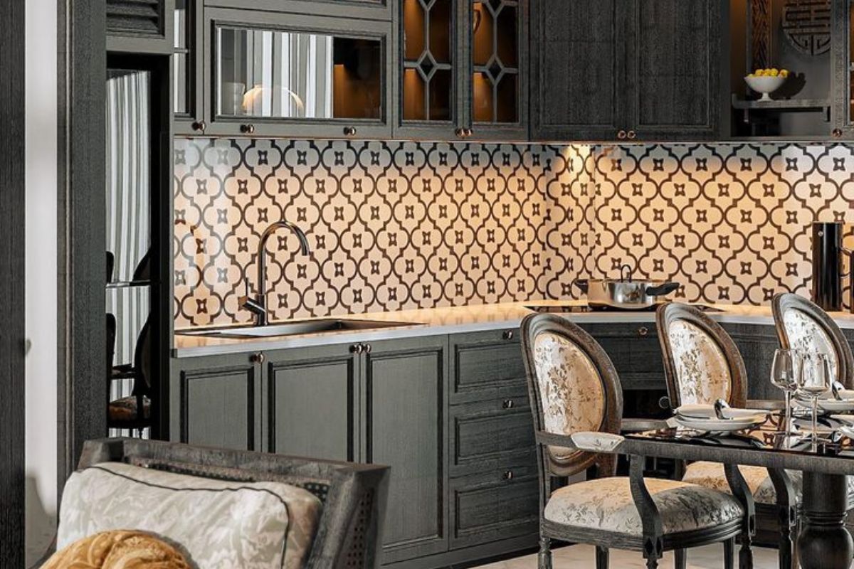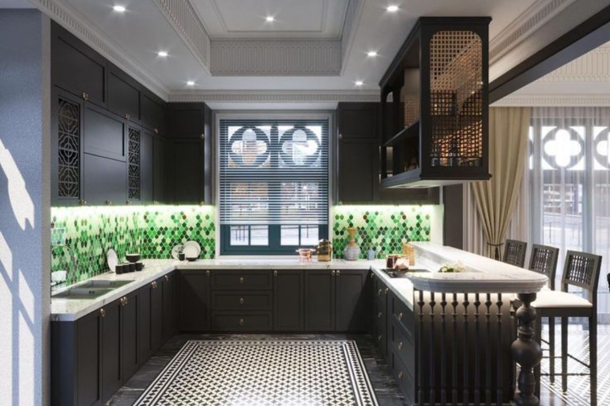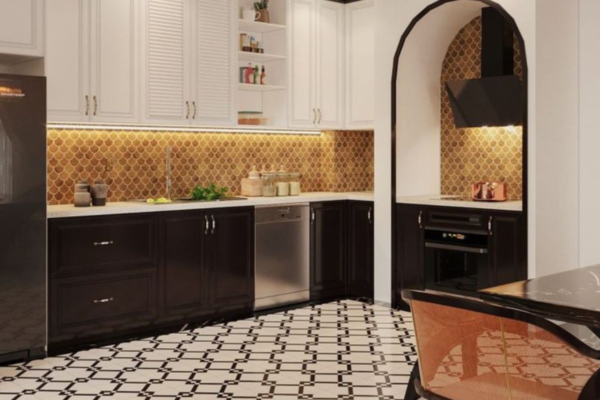 Tủ bếp có thiết kế đường nét sạch sẽ, hoa văn được đưa vào một cách tinh tế thông qua việc sử dụng kính ốp tường họa tiết hoặc gạch subway với đường viền màu. Khu vực bếp được trang bị đầy đủ thiết bị hiện đại như bếp từ, máy hút mùi âm tủ, nhưng tất cả đều được "cải trang" khéo léo để hòa hợp với tổng thể.