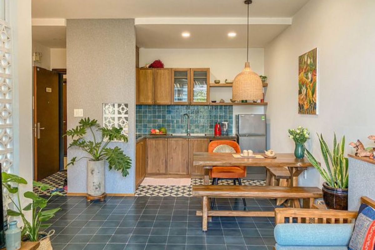 Mẫu bếp này phù hợp với các căn hộ hiện đại có diện tích hạn chế nhưng vẫn muốn có bếp Indochine đẹp mắt. Khu vực bếp được thiết kế mở, liên thông với phòng khách thông qua các chi tiết như vách ngăn mây tre, cửa sổ gỗ hoặc đơn giản là sự khác biệt về màu sắc sàn nhà.
