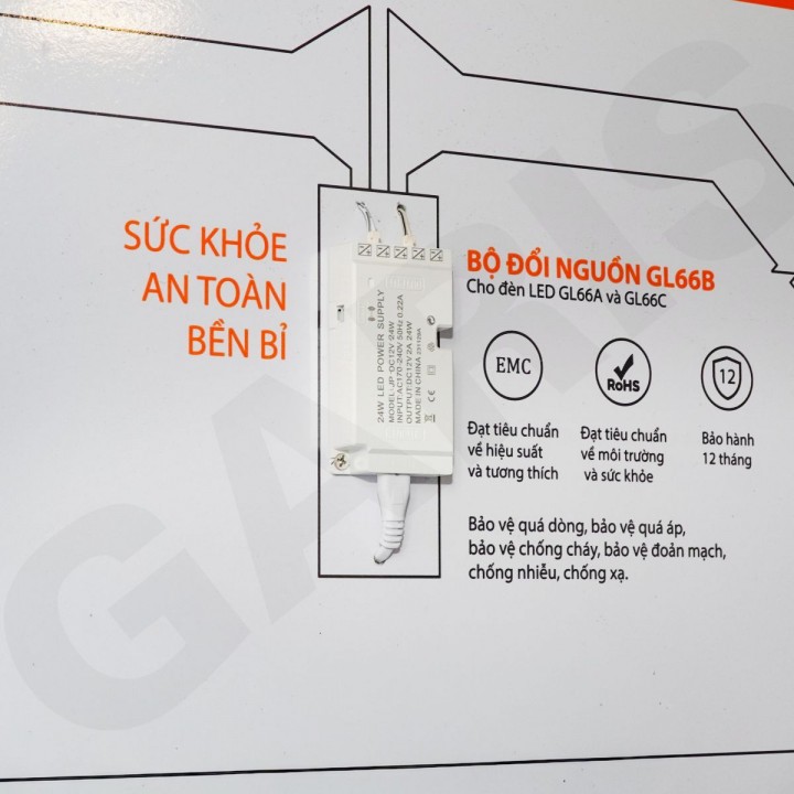 - Bộ đổi nguồn từ 220V xuống 12V - Điện 2 chiều 100 - 240V, công suất tối đa 24W - Mỗi bộ đổi nguồn dùng cho không quá 3 đèn LED GL66A, hoặc tối đa 2 đèn LED GL66A và 3 đèn LED GL66C, hoặc tối đa 6 đèn LED GL66C |