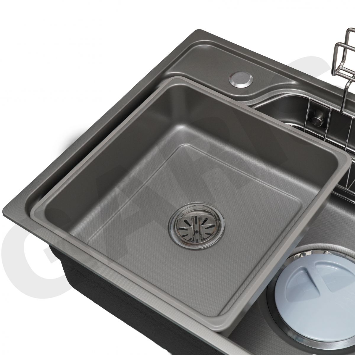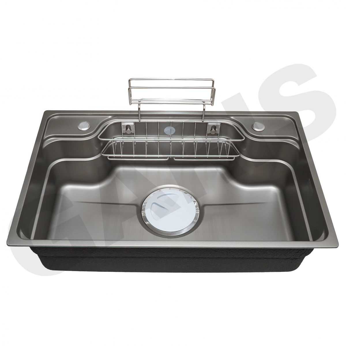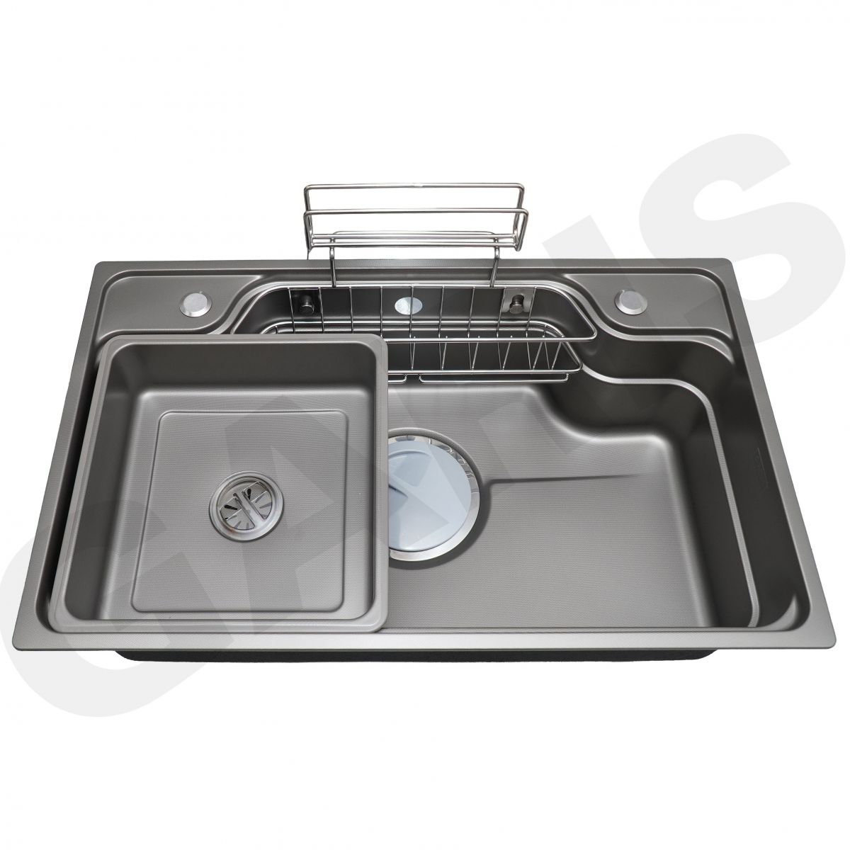- Chất liệu inox 304 phủ nano màu titan: Chậu rửa được làm từ chất liệu inox 304, được phủ nano màu titan. Chất liệu này không chỉ đảm bảo độ bền và chống gỉ sét của chậu, mà còn tạo ra một diện mạo sang trọng và hiện đại cho căn bếp của bạn.