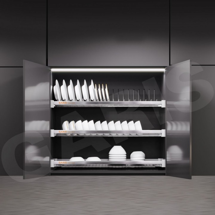 Sản phẩm giá bát đĩa inox 3 tầng này chuyên dụng để lắp âm ở phần tủ bếp trên, thường được các bà nội trợ sử dụng để chứa các loại bát đĩa, cốc chén, đồ đựng thực phẩm… thường xuyên sử dụng và lau dọn hàng ngày. Sản phẩm là một trong những thiết kế thông minh hiện đại cần có trong bất cứ thiết kế tủ bếp hiện đại nào bây giờ. Gía bát đĩa inox 3 tầng cho tủ bếp trên được đặt âm bên trong tủ bếp. Chỉ khi mở cánh tủ mới có thể sử dụng, vì vậy vừa tiết kiệm không gian, vừa đảm bảo tính thẩm mỹ cho gian bếp.