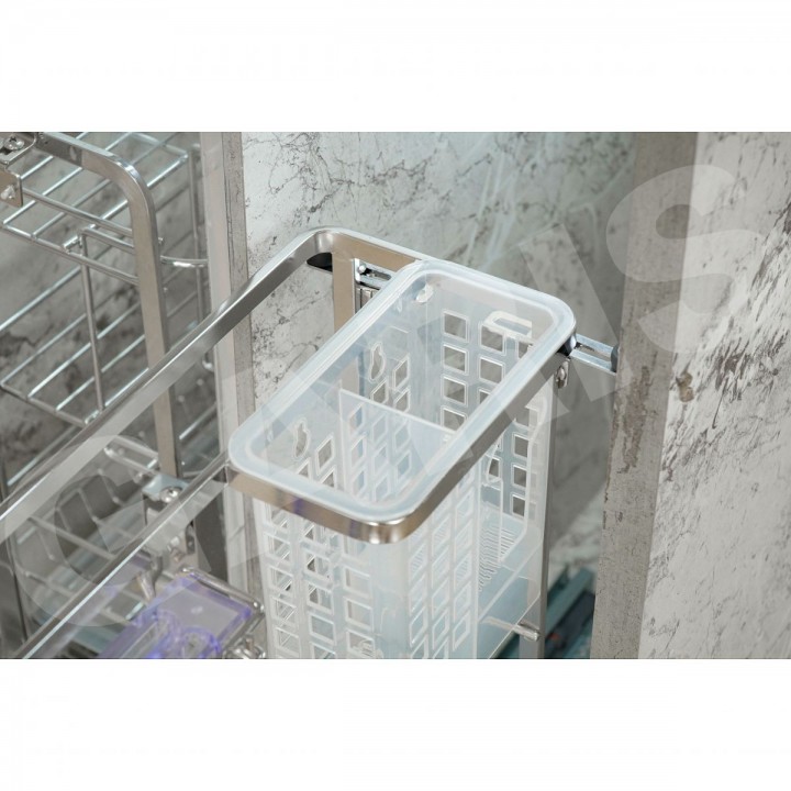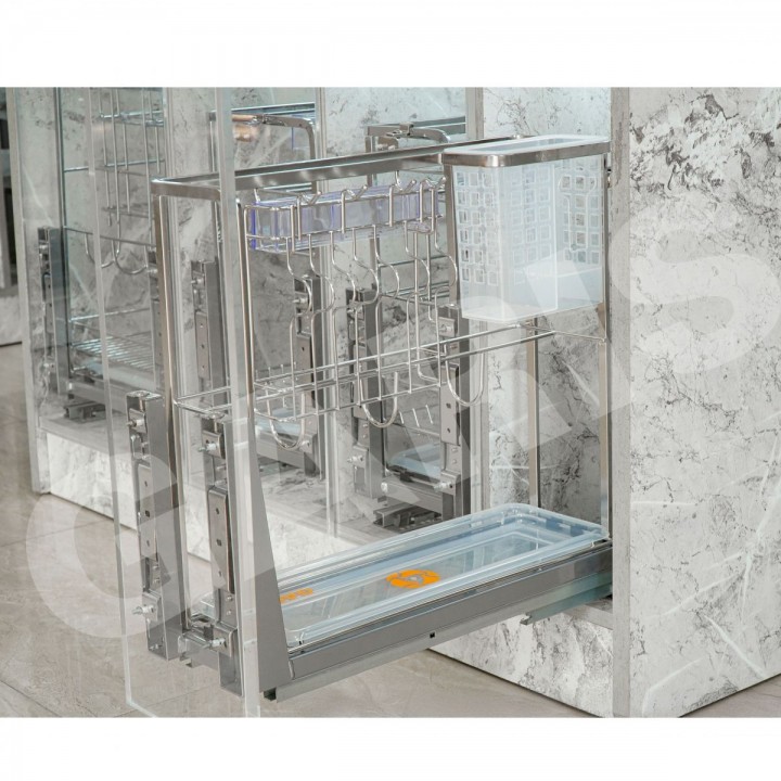 Đặc điểm: Có chống rung 2 bên, rổ để gia vị có thể nhấc ra dễ dàng, phụ kiện liên kết rổ và cánh tủ bằng inox 304.| Mã sản phẩm | Quy cách Rộng x Sâu x Cao (mm) |