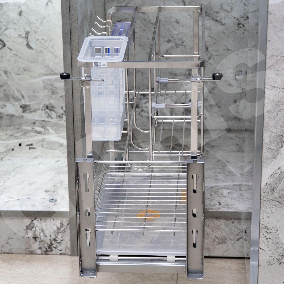 - Giá dao thớt, chai lọ có khả năng điều chỉnh lên xuống ra vào trái phải, giúp tùy chỉnh theo kích thước và nhu cầu sử dụng. Điều này giúp tối ưu hóa không gian và tiện lợi trong việc sử dụng.