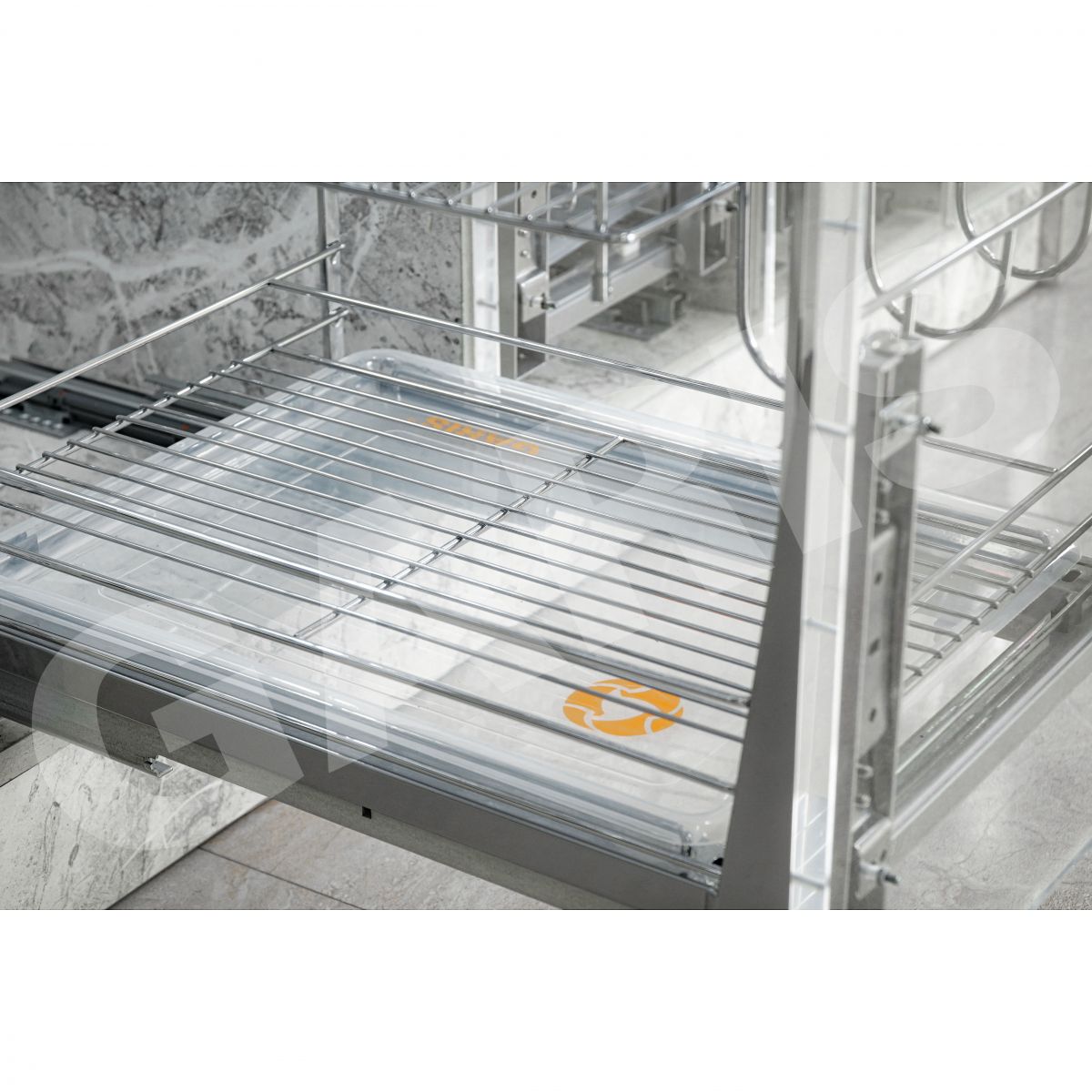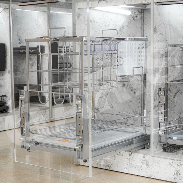 Duy nhất tại Việt Nam có chống rung 2 bên, phụ kiện liên kết rổ và cánh tủ bằng inox 304, rổ phụ để gia vị có thể nhấc ra dễ dàng (GM02.35C, GM02.40C)