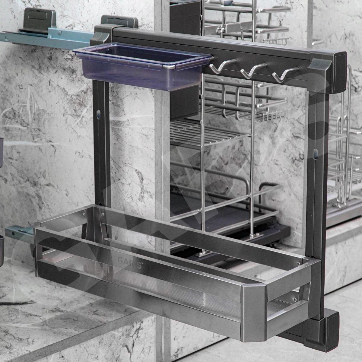 Sản phẩm bằng chất liệu inox, thép và nhựa.Thiết kế thông minh giúp chai lọ sẽ không bị nghiêng đổ khi đóng/mở cánh tủ, dễ dàng lau chùi vệ sinh.