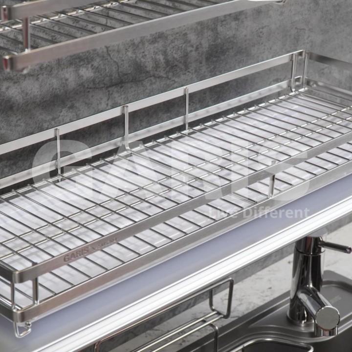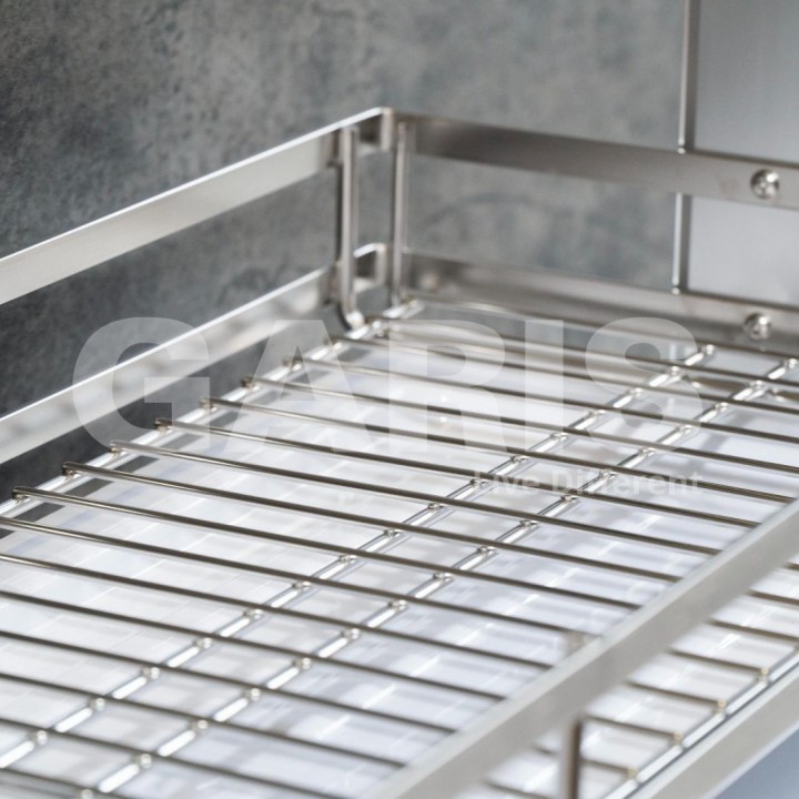 - Giá bát đĩa nâng hạ điện được làm từ khung nhôm chắc chắn, giúp tăng độ bền và độ ổn định của sản phẩm. Rổ gia vị được làm từ inox 304 điện hóa, có khả năng chống gỉ và bền bỉ theo thời gian.