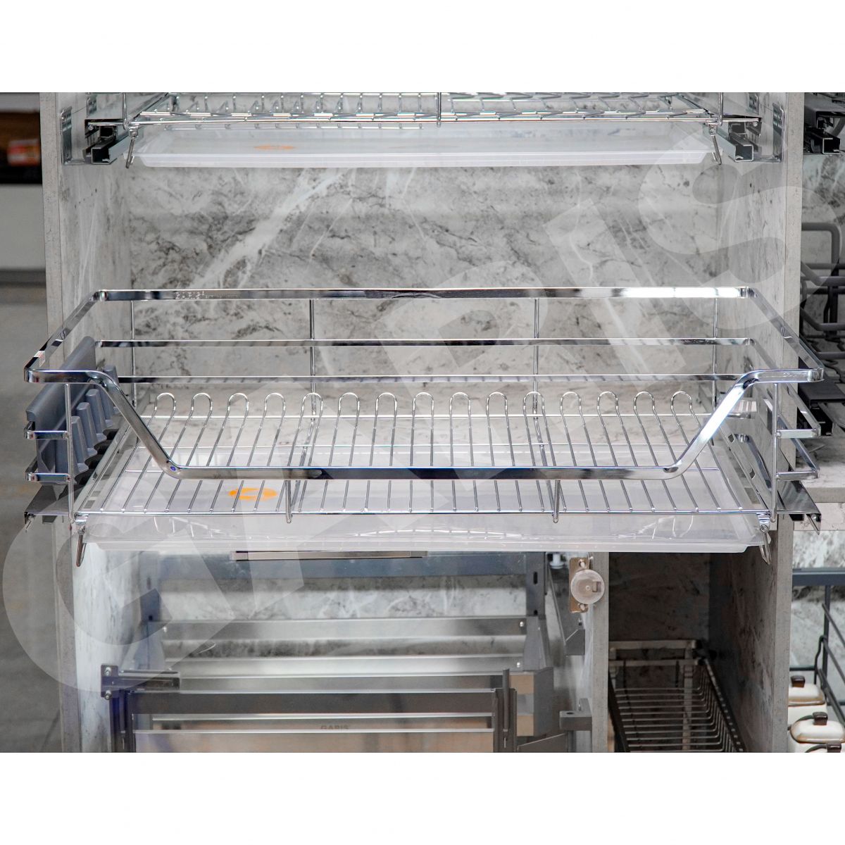 Gợi ý kết hợp phụ kiện khi thiết kế căn bếp : Căn bếp sẽ đẹp hơn khi kết hợp 01 giá xoong nồi GP04C với 01 giá bát đĩa GD04C trong một khoang tủ, đồng thời kết hợp thêm các sản phẩm khác trong PREMIUM Series