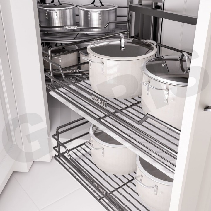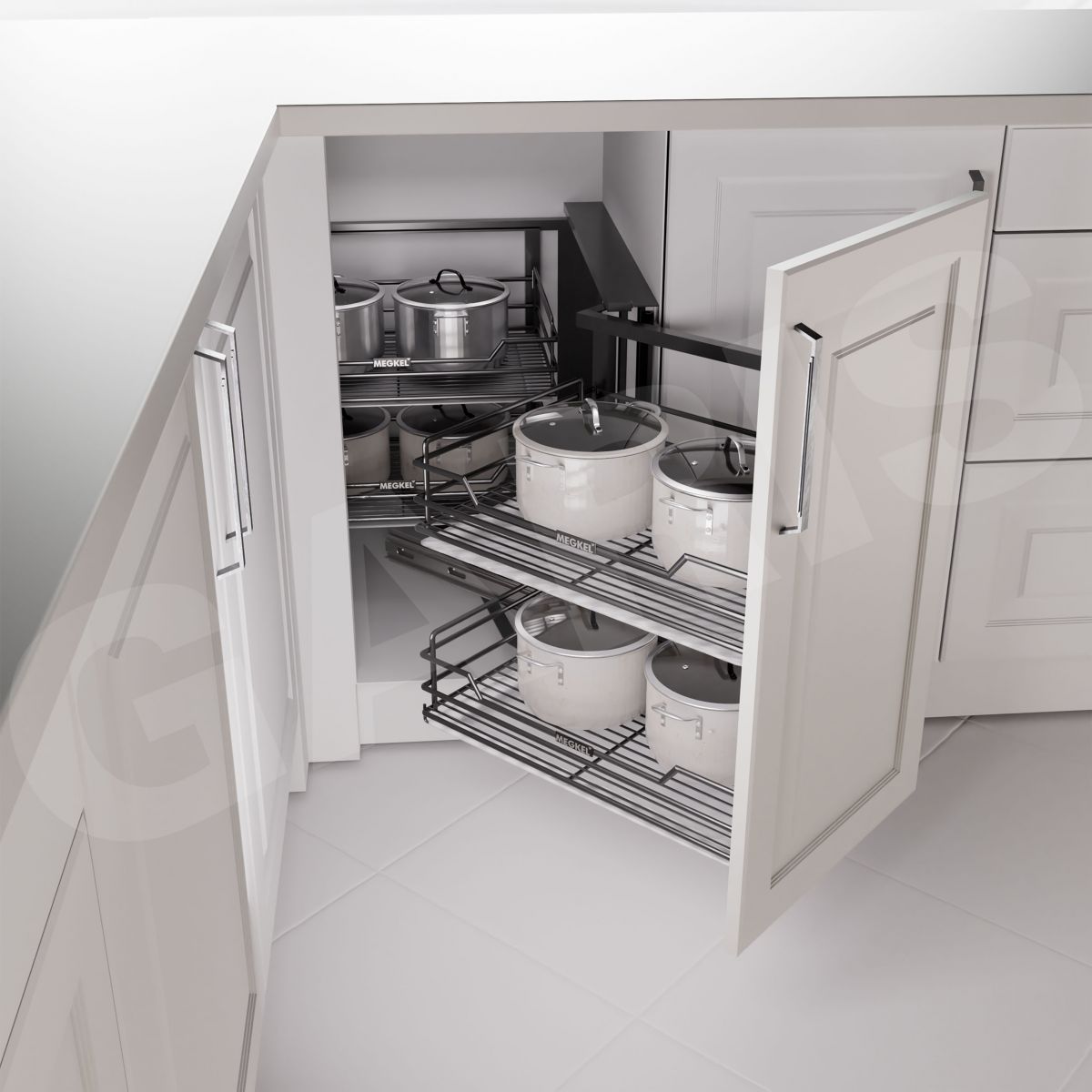 - Cơ cấu chuyển động thông minh, ray giảm chấn: Hệ góc liên hoàn được thiết kế với cơ cấu chuyển động thông minh, giúp dễ dàng di chuyển và lưu trữ các vật dụng trong tủ. Ray giảm chấn giúp giảm tiếng ồn và đảm bảo sự êm ái và mượt mà trong quá trình mở và đóng.