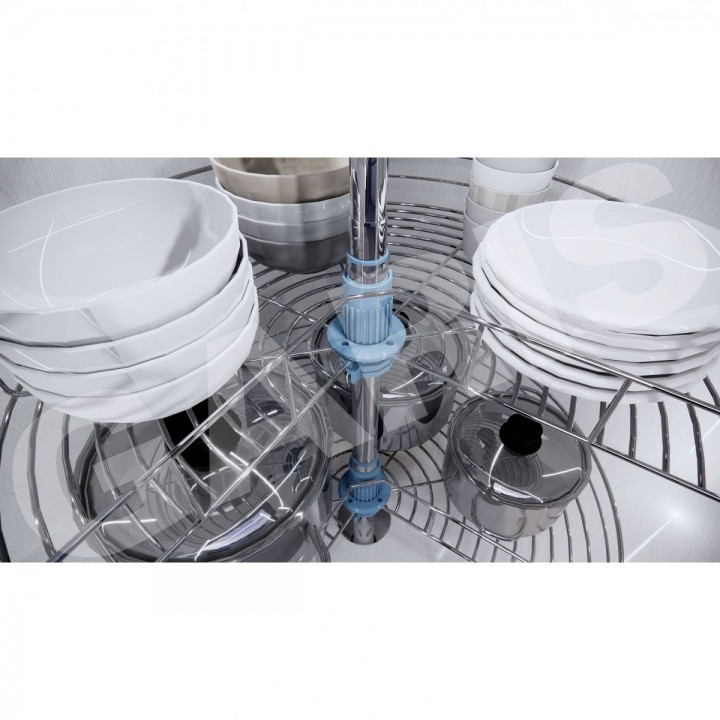 Mâm xoay ¾ là một sản phẩm được làm từ chất liệu inox chống gỉ được thiết kế 2 tầng riêng biệt, mỗi tầng có cấu tạo bằng 3/4 của hình tròn để khi mở cánh tủ ta có thể mở được cánh tủ hoàn toàn 180 độ. Nhờ đó có thể tối ưu sức chứa đồ đạc ở trong gia đình. Hệ Mâm Xoay 3/4 Góc Mở GS05.80C Đặc điểm: cơ cấu chặn xoay tròn 2 tầng