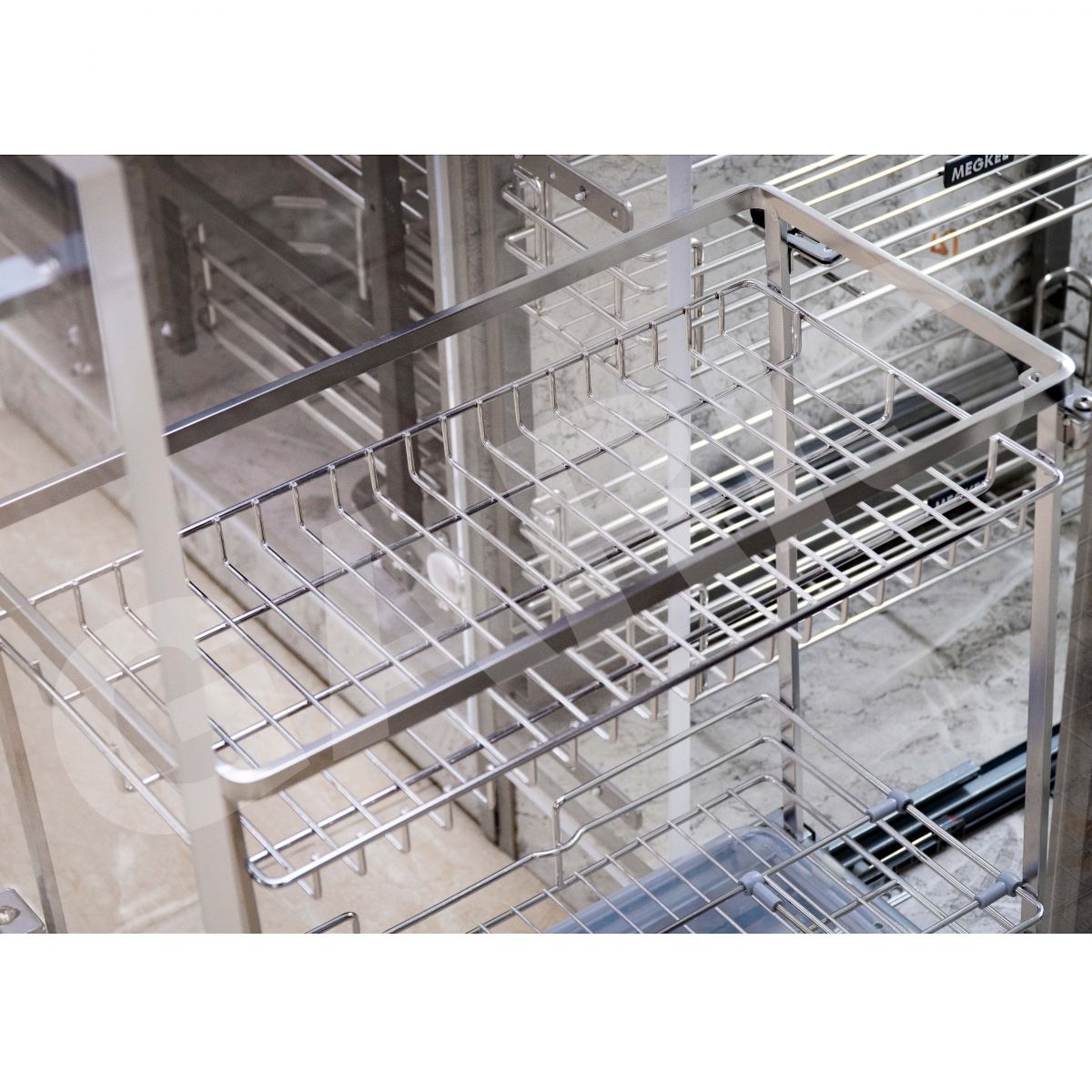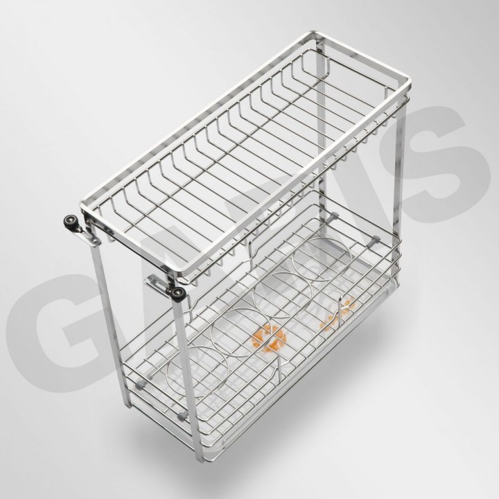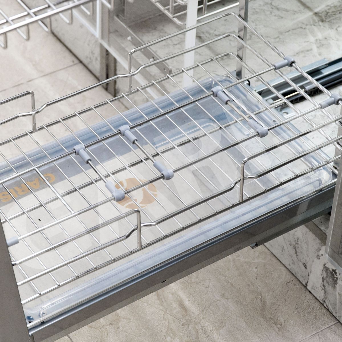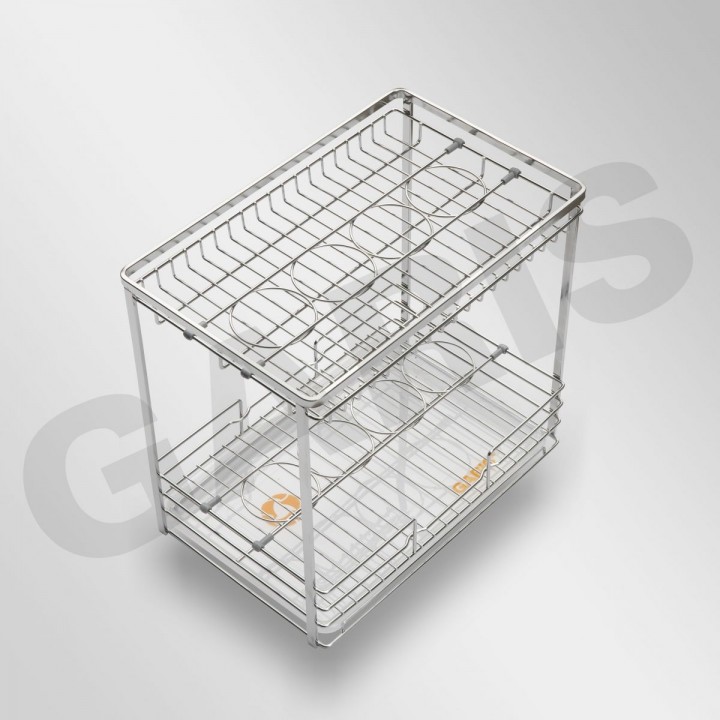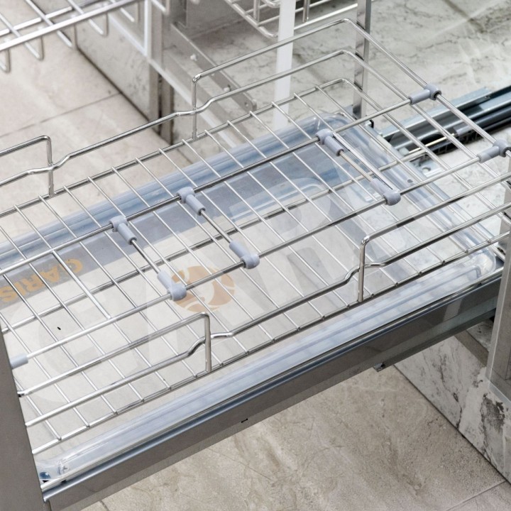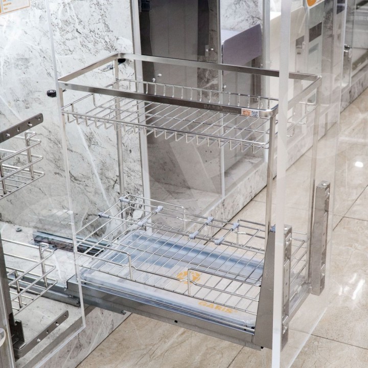 Đặc điểm: Duy nhất tại Việt Nam có chống rung 2 bên (mã GK02.35E/ GK02.40E không có chống rung), rổ để gia vị có thể nhấc ra dễ dàng, phụ kiện liên kết rổ và cánh tủ bằng inox 304.