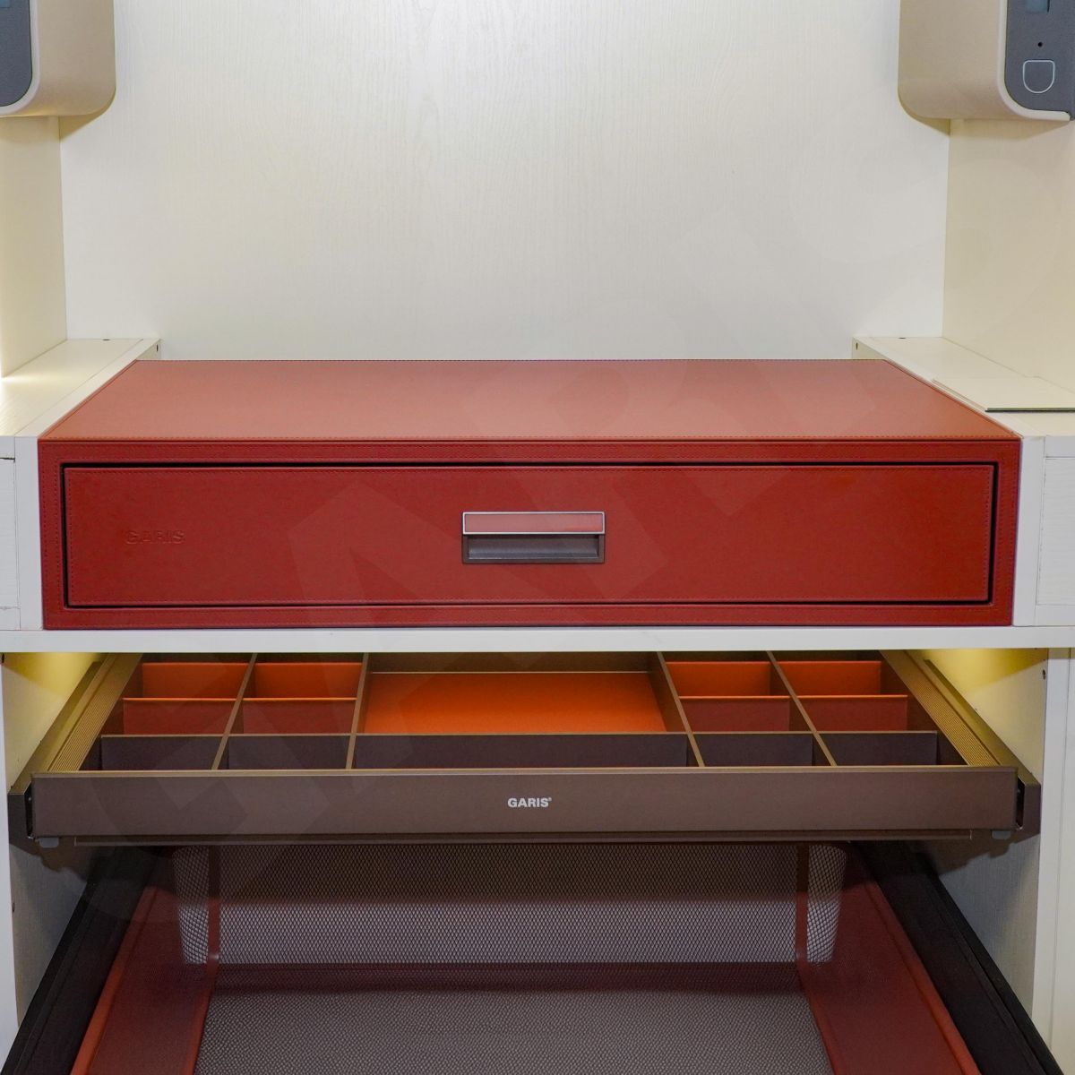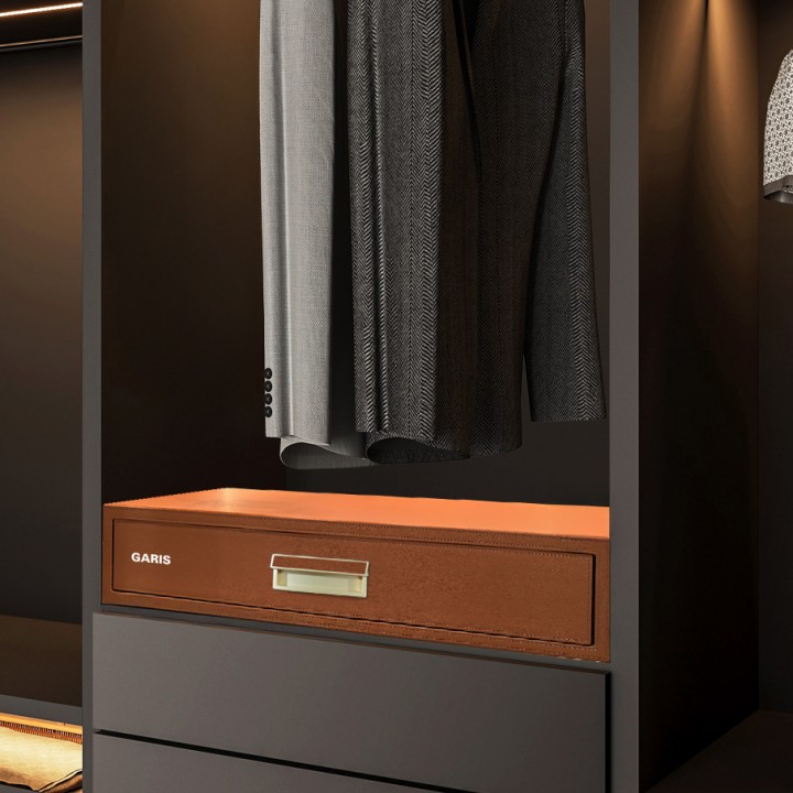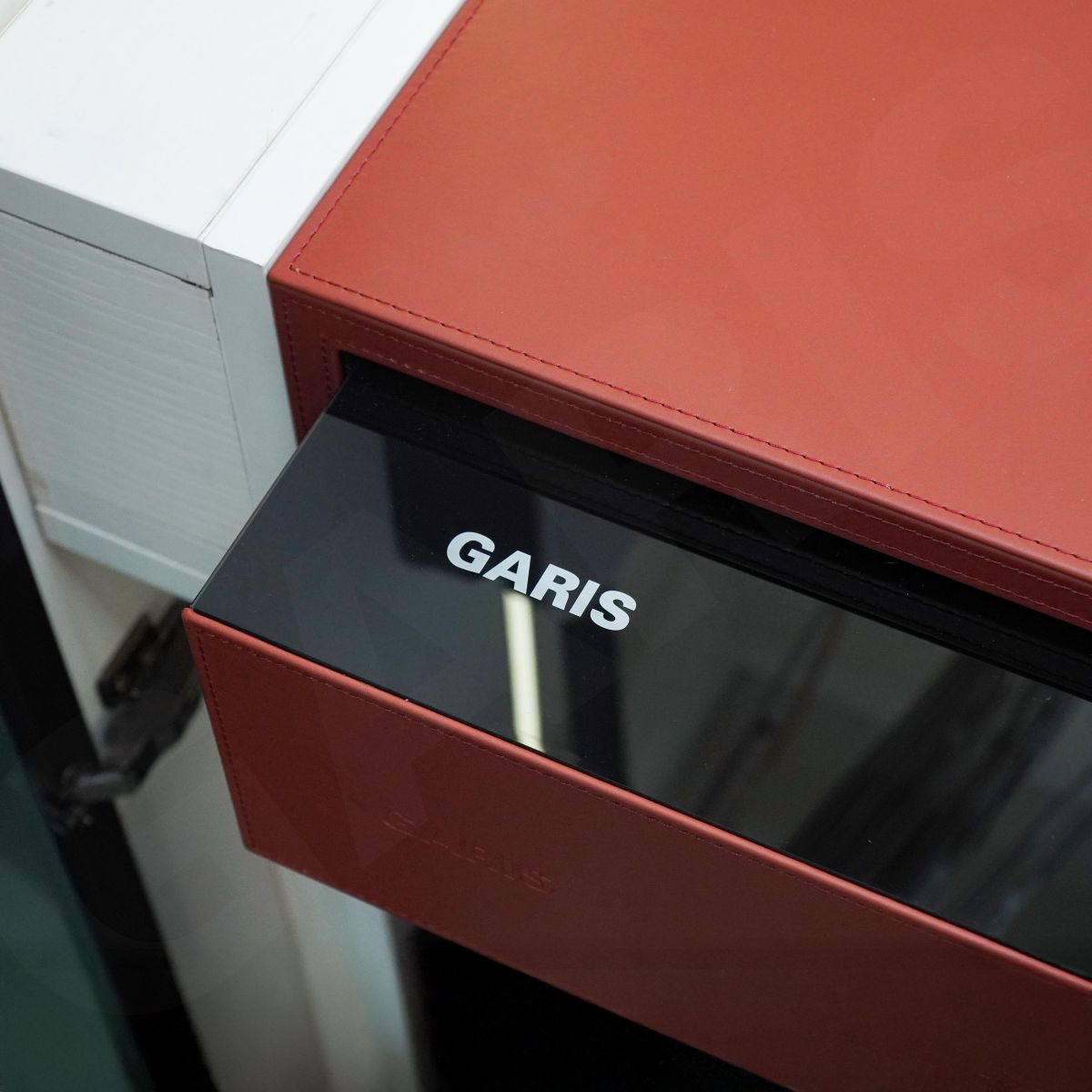 Thùng bằng thép, mặt trước và mặt trên bọc da màu đỏ CarnelianTải trọng: 10kg