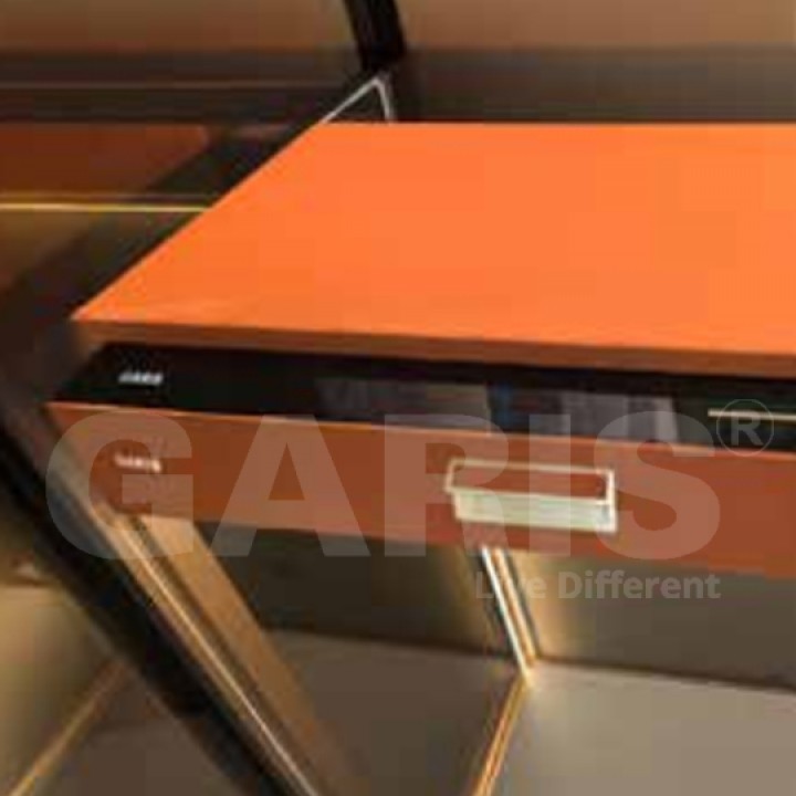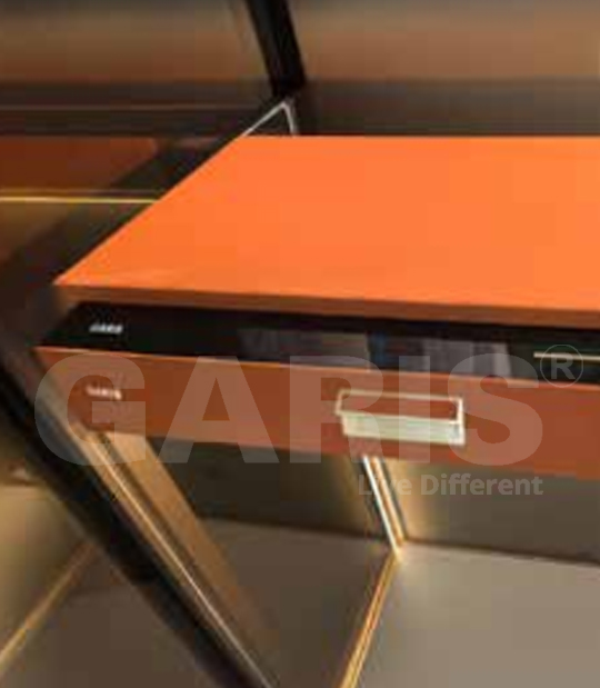 Chất liệu, màu sắc: Thùng bằng thép, mặt trước và mặt trên bọc da màu đỏ Carnelian