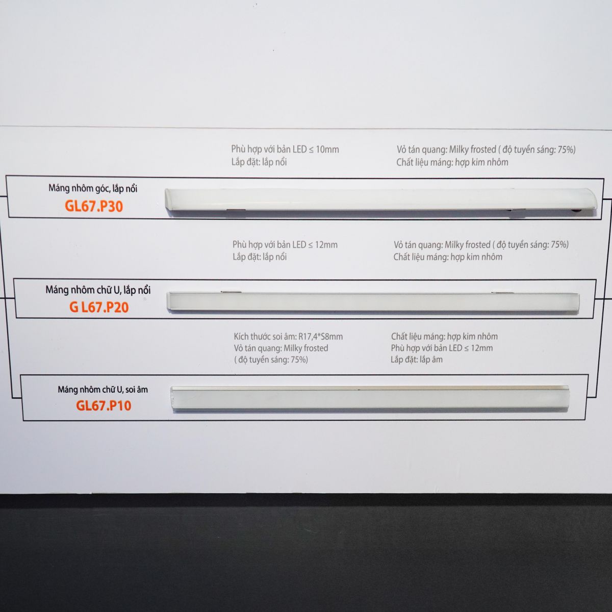 Máng nhôm chữ U đèn led, soi âm GL67.P10