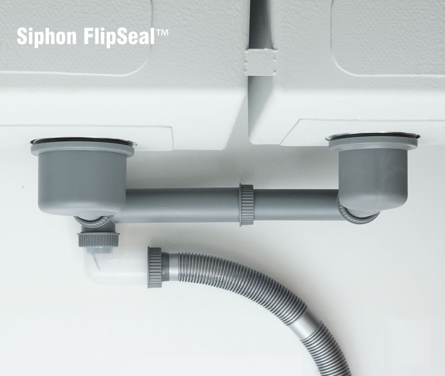 | Siphon FlipSeal™ Siphon cải tiến với công nghệ FlipSeal™ được thiết kế ống dẫn dạng nắp lật thông minh giúp khóa mùi triệt để mà không cần khay nước, giúp ngăn trào ngược và giữ cho bếp luôn khô thoáng. Hệ thống ống xả SlimDrain™ gọn nhẹ, kết nối linh hoạt, dễ lắp đặt và tiết kiệm tới 30% diện tích tủ. |