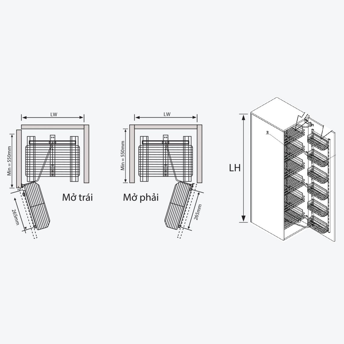 Đặc điểm: Sử dụng 2 ray giảm chấn bắt đáy đối xứng hai bên và 1 ray bắt trần tủ. Khung có thể điều chỉnh được độ cao 1180mm - 1564mm