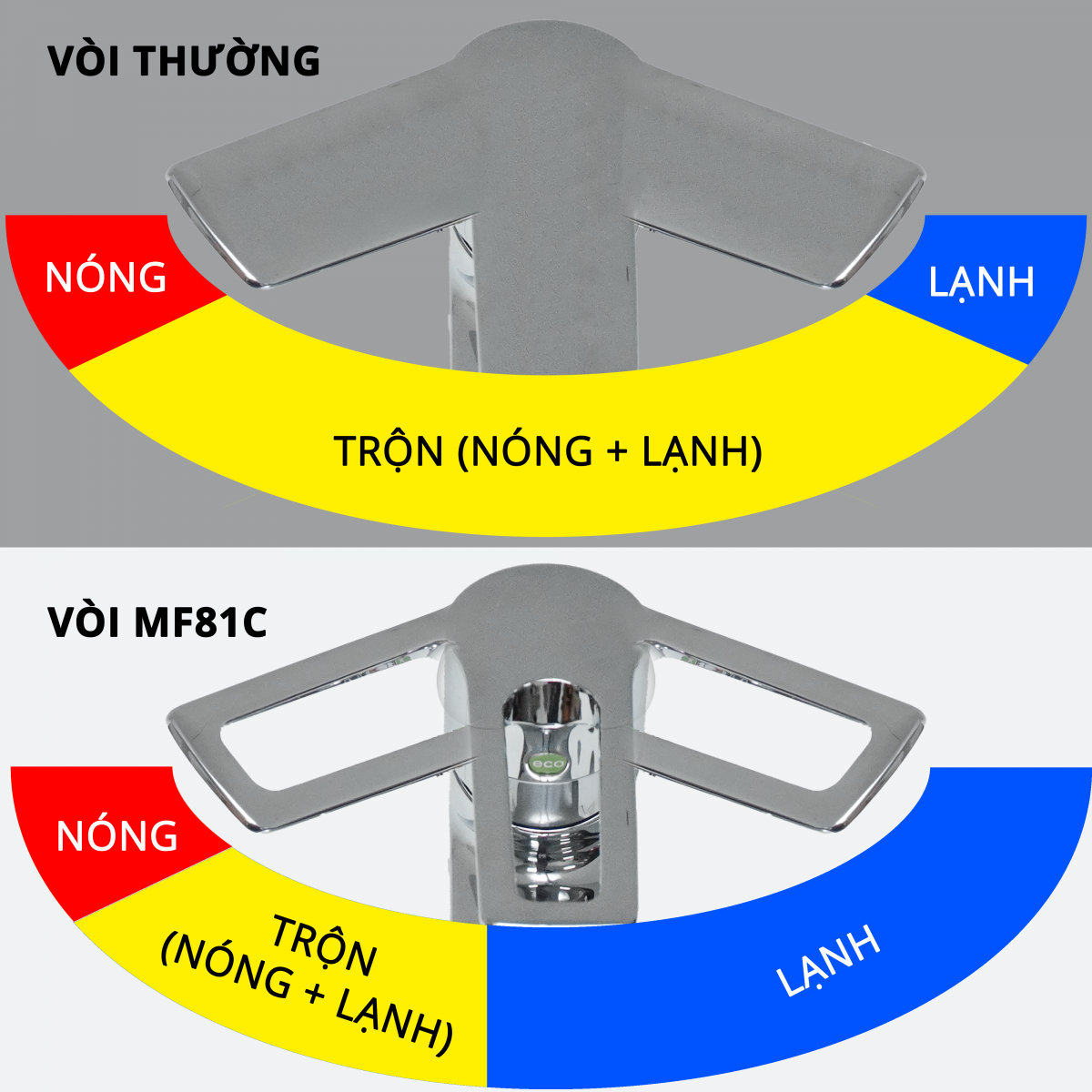 | - Cần gạt lên - xuống. Không như vòi thông thường, cần gạt của vòi rửa bát MF81C khi thao tác lên xuống (mở - đóng) có 2 nấc riêng biệt, giúp người sử dụng có thể tuỳ chọn mở nước ít hay nhiều Giữa 2 nấc này khi gạt lên, xuống đều phân biệt bằng tiếng “tách” như khi nhấp chuột máy tính và cảm giác cơ khí; qua đó giúp tránh lãng phí nước khi sử dụng. |
