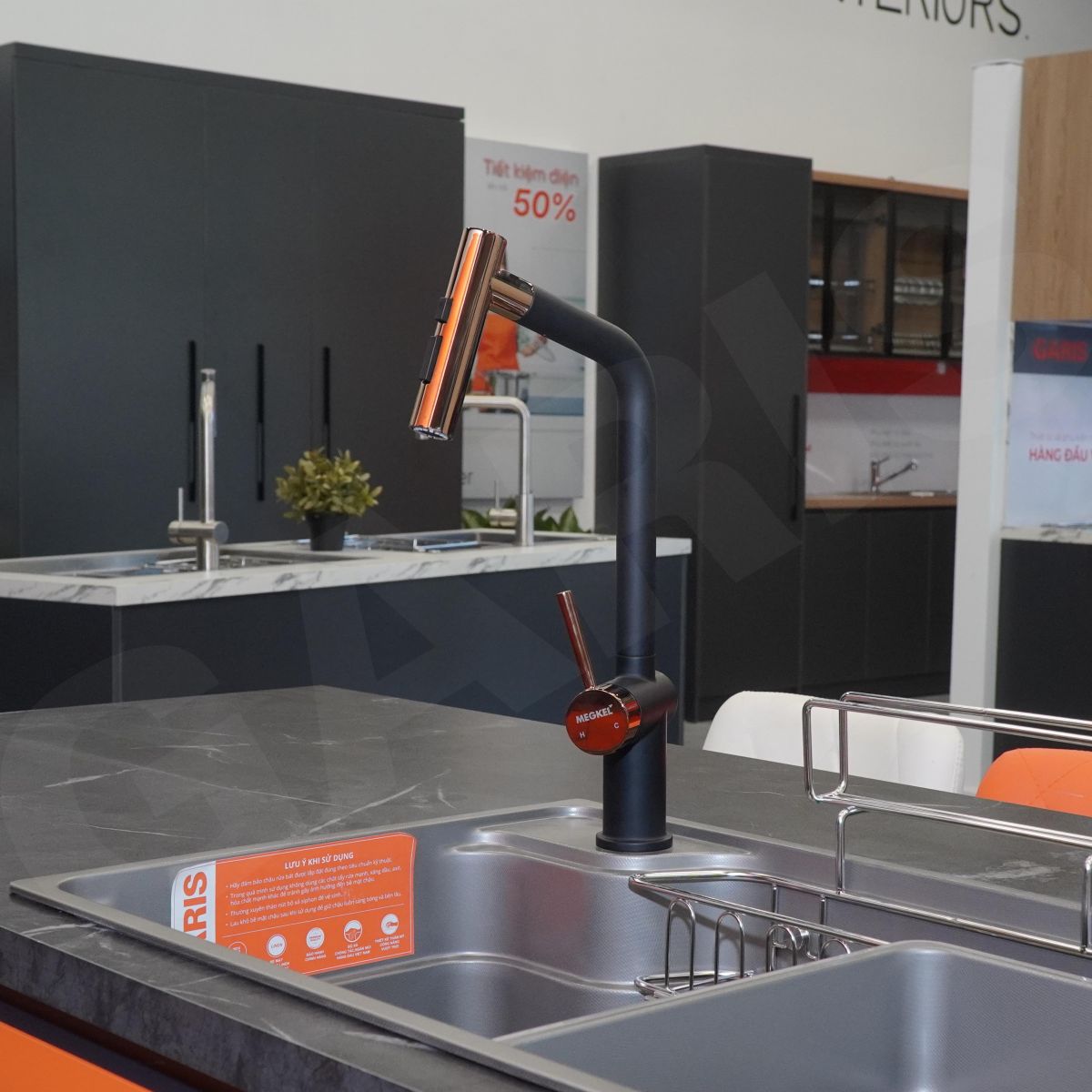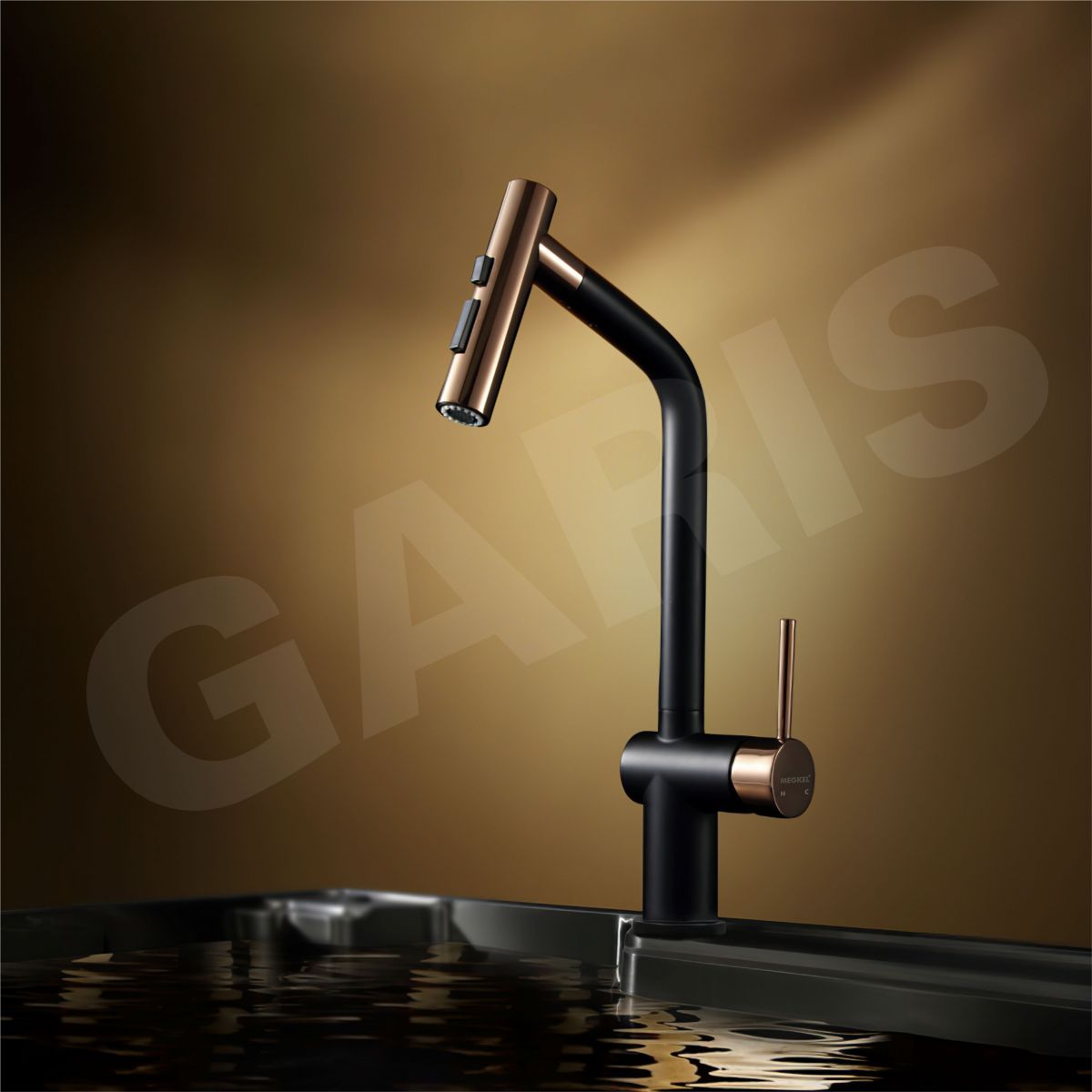 Vòi chậu rửa bát có dây rút, bằng đồng, mạ PVD màu vàng hồng và màu đen nhám2 nguồn nóng lạnh
